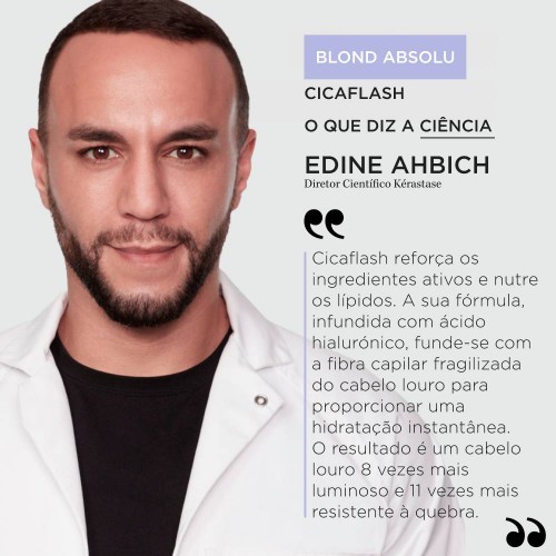 Cicaflash é um condicionador em gel leitoso opalescente com uma tonalidade suave de lavanda oferece o desempenho reparador de uma máscara com o acabamento leve de um condicionador. Repara intensivamente o cabelo sensibilizado, nutrindo a fibra. A combinação de Ácido Hialurónico com flor de Edelvaisse suaviza e fortalece instantaneamente o cabelo aclarado sensibilizado enquanto o nutre em profundidade. Ideal para todos os cabelos aclarados ou com descoloração, Cicaflash repara a fibra capilar, prevenindo a quebra e a erosão. O cabelo fica suave e hidratado sem perder a sua leveza e luminosidade.