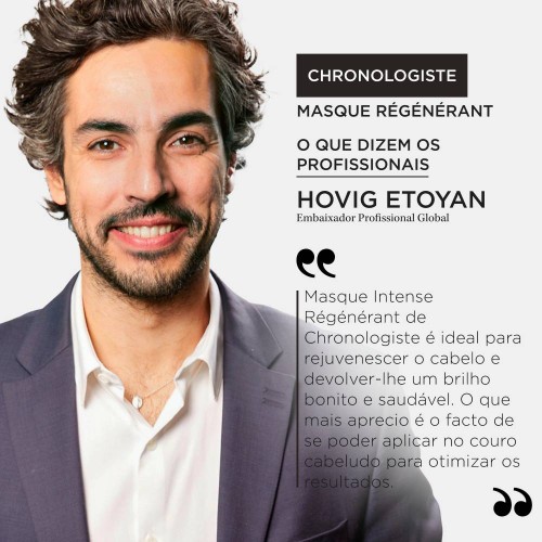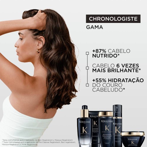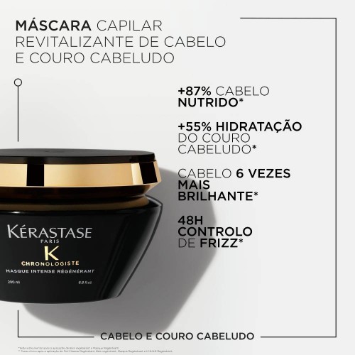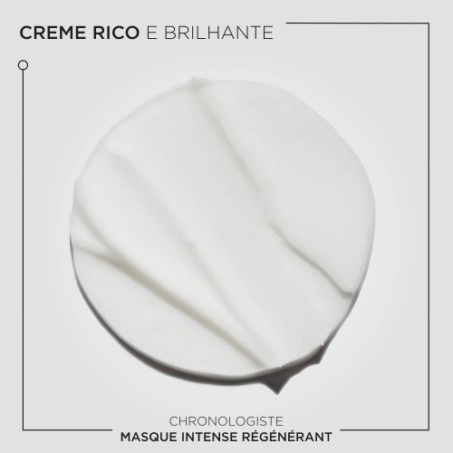 Máscara regeneradora que nutre intensamente o cabelo. Enriquecida com Ácido Hialurónico, Abyssine e Vitamina E para combater os sinais de envelhecimento do cabelo e couro cabeludo. Confere uma hidratação intensa e duradoura, uma ação frizz-control, 6x mais brilho, fibra fortalecida e cabelo voluptuoso. Infundida com a envolvente fragrância Chronologiste, que inclui os aromas de chá de rosa, madeiras leves e almíscar. A Masque Intense Régénérant é uma experiência de luxo sensorial.