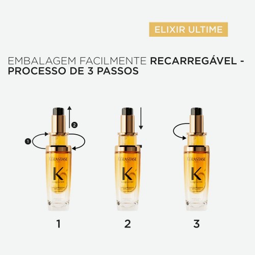 Aplicar no cabelo húmido. Elixir Ultime facilita o styling e a secagem. Entra na fibra nutrindo e suavizando o cabelo.