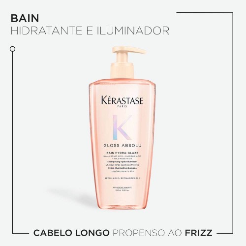 Bain Hydra-Glaze de Kérastase é um champô hidratante e iluminador para cabelo comprido com tendência ao frizz. É especialmente formulado com ácido hialurónico, ácido glicólico e rosa Selvagem em óleo para proporcionar um cabelo de sonho, com Gloss e com movimento.