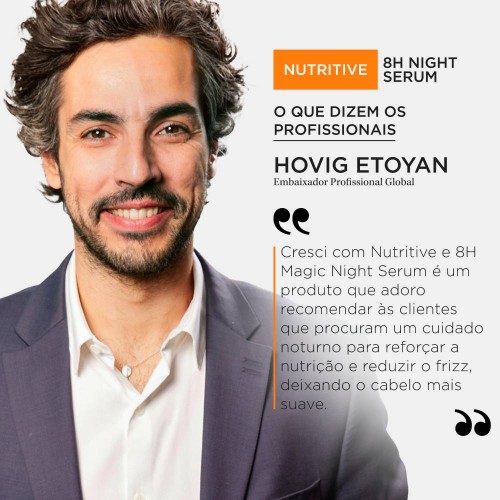 Este sérum de noite funciona durante 8 horas para revitalizar e regenerar o cabelo seco e possui uma textura bege clara e cremosa. Cabelo 98 % mais forte*.