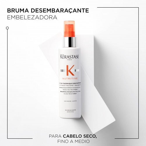 Lotion Thermique Sublimatrice de Kérastase é uma bruma desembaraçante embelezadora para cabelo muito seco, fino a médio. Esta bruma para cabelo seco contém lípidos nutritivos para condicionar intensamente o cabelo e fortalecer a fibra capilar e nutrientes essenciais que potenciam a capacidade da fórmula de nutrir e fortalecer o cabelo.