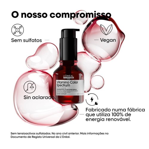 Sérum de brilho Vitamino Color Spectrum de L’Oréal Professionnel. Este sérum profissional desenvolvido para proporcionar um brilho cristalino instantâneo ao cabelo com coloração. Formulado com 5% de Alfa-silano, reveste a fibra capilar para proporcionar uma proteção anti-frizz e protege o cabelo da humidade e calor até 230ºC*. Ideal para manter a cor vibrante e protegida, com resultados que duram até 10 lavagens**. Além disso, a sua tecnologia ajuda a preservar a intensidade da cor.