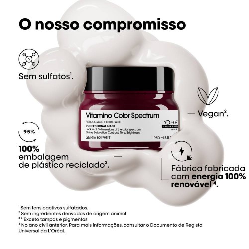 Máscara Vitamino Color Spectrum de L’Oréal Professionnel. Uma máscara formulada para nutrir intensamente e proteger o cabelo com coloração. Uma fórmula enriquecida com ácido ferúlico e ácido cítrico, que protege e preserva a cor, proporcionando um brilho intenso e uma textura suave. Ideal para un cabelo mais exigente. Mantém a cor vibrante até 100 dias*.