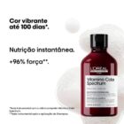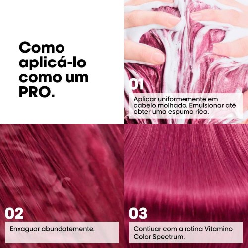 Vitamino Color Spectrum de L’Oréal Professionnel. Este shampoo profissional é formulado para proteger e preservar a cor do cabelo com coloração. Uma fórmula com ácido ferúlico e ácido cítrico que permite manter a cor vibrante até 100 dias*. Além disso, a sua textura cremosa limpa a fibra deixando o cabelo nutrido e mais forte. Ideal para todos os tipos de cabelo com coloração.