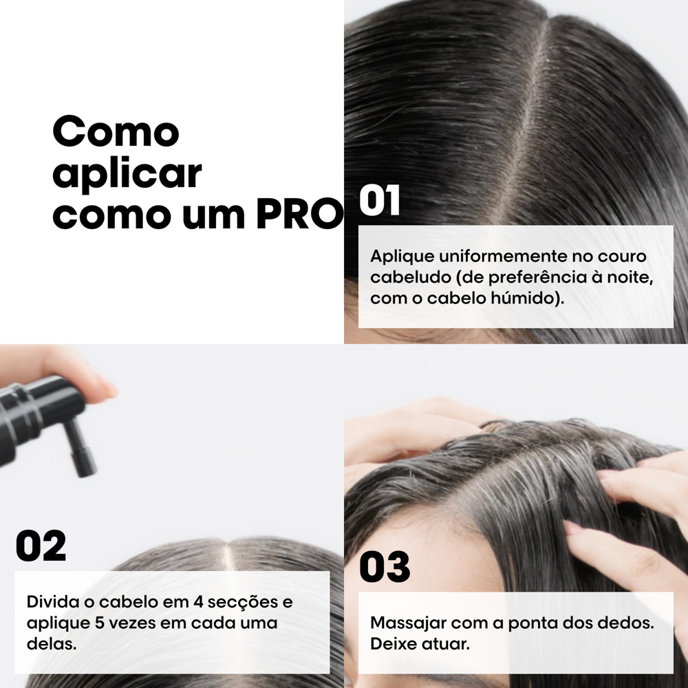 Aplicar uniformemente no couro cabeludo Dividir o cabelo em 4 secções e pulverizar 6 vezes em cada secção. Massajar com a ponta dos dedos. Deixar atuar sem passar por água.